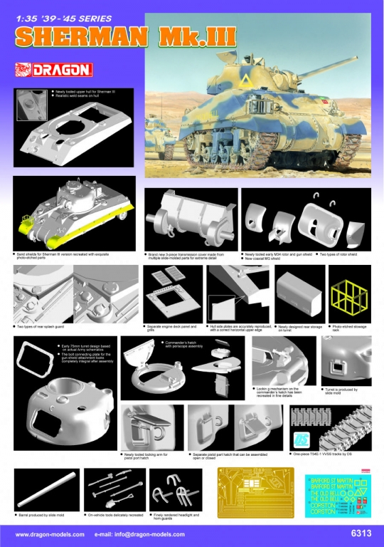 The Sherman III is the British nomenclature for the M4A2 model fitted with a 75mm gun. The kit includes a number of completely new parts in keeping with the Sherman III variant, items such as a three-piece transmission cover, gun shield, weld seams and a specially tooled upper hull. Photo-etched parts are also present, which allow the accurate replication of parts such as sand shields and storage racks that were so common in Commonwealth tanks operating in the North African and Mediterranean campaigns. T54E-1 VVSS tracks