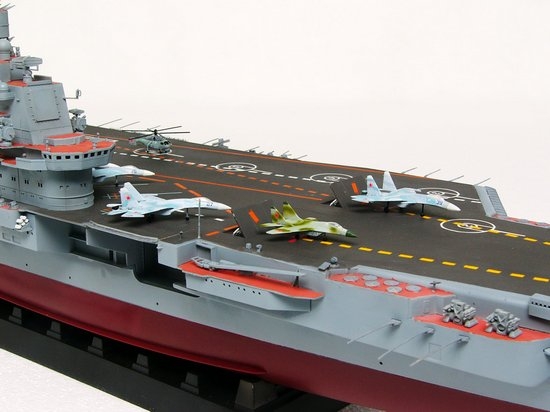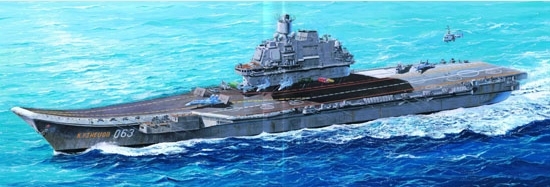 The Kuznetsov Class heavy aircraft carrying cruiser, also known as Project 1143.5 or Orel Class, was constructed at Nikolayev South Shipyard on the Black Sea in the Ukraine. The Kuznetsov aircraft carriers displaced roughly 65,000 tons and for the first time carried conventional take-off and landing aircraft. These included navalized versions of fourth-generation fighters, such as the Su-27K (later 'Su-33') and the MiG-29K, along with a converted Su-25 and several planned new designs. The bow of the Kuznetsov sloped upward in a twelve-degree "ski jump", which would permit short-take-offs from her relatively small deck. In addition to the air wing, Kuznetsov carried a dozen launchers for SS-N-19 anti-ship missiles, SA-N-9 and CADS-N-1 air defense complexes, and a pair of RBU-12000 ASW mortars. Admiral Kuznetsov was equipped with the Sky Watch 3D radar. Admiral Kuznetsov was launched in 1985; the intervening political turmoil delayed her formal commissioning until 1991, and she did not become fully operational until 1995. A second-of-class vessel, the Varyag, was launched in 1988 but was never commissioned. Admiral Kuznetsov is the only aircraft carrier in the Russian Navy.