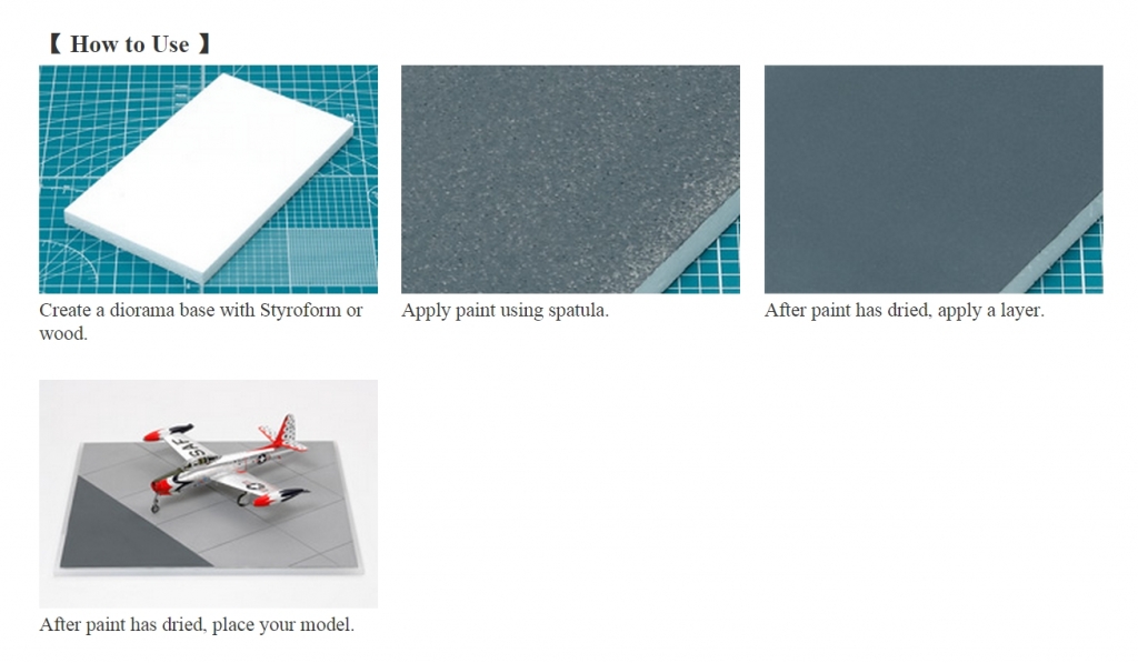This water-based paint features a paste-like texture with ceramic particles for recreating asphalt surfaces. The surface becomes rough & gritty once it has dried. 1 bottle contains 100ml of paint which covers B4-sized area (2 coats). Drying time: 4-5 hours.