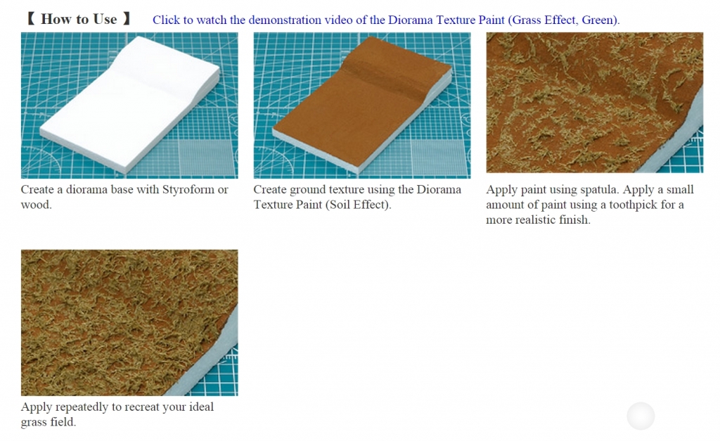 This water-based paint features a paste-like texture with 5mm colored fibers for recreating grassy surfaces. Apply this over Diorama Texture Paint Soil Effect (87108, 87109, 87121) for the best result. 1 bottle contains 100ml of paint which covers B4-sized area (1 coat). Drying time: 4-5 hours.