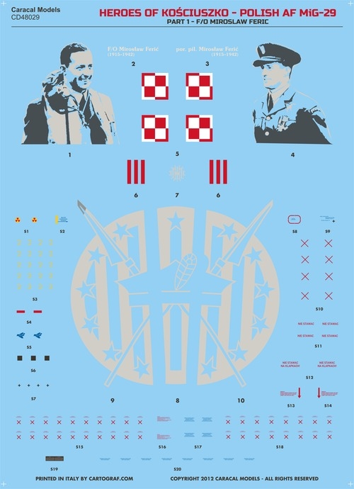 The first sheet provides markings for MiG-29 "111", which was decorated to commemorate Polish WWII hero Flight Officer Miroslaw Feric