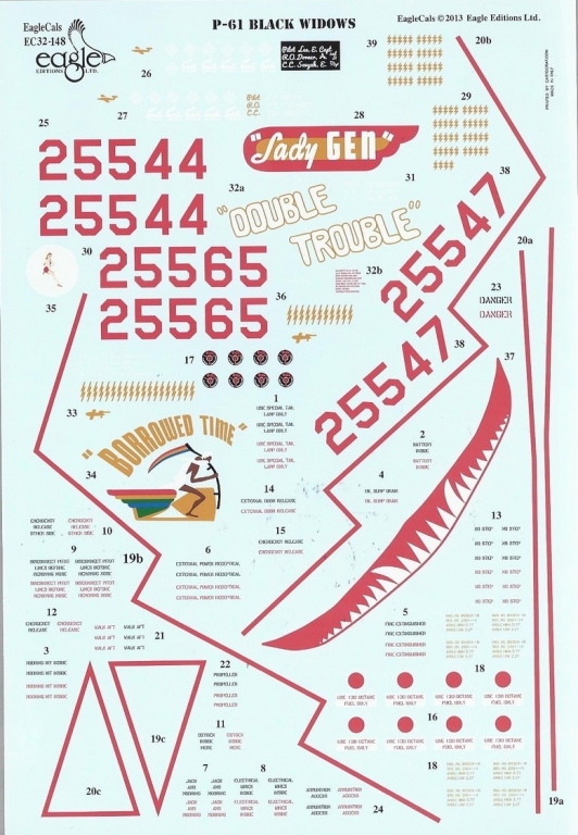 "With the release of the 1/32nd scale Hobby Boss Black Widow and some additional research it is apparent that the kit is much closer to a P-61A than a P-61B as boxed. Buy trimming a small portion of the forward fuselage off, an easy conversion for the modeler, a fairly accurate P-61A can result. Consequently, we have scaled up our earlier P-61A markings in 1/72nd and 1/48th scales to 1/32nd scale for this exciting new release from Hobby Boss."