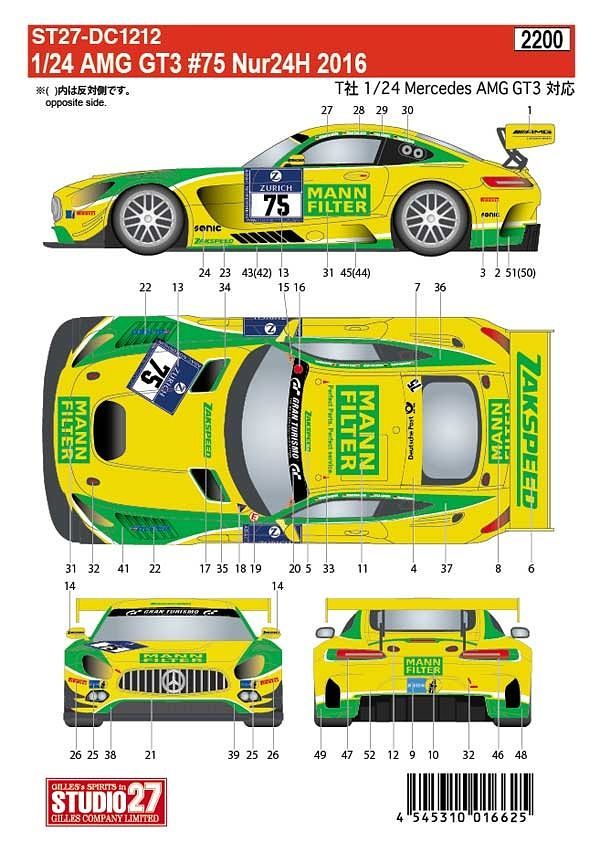 Studio27 DC1212 1/24 AMG GT3 #75 Nur24H 2016 (Decal) for Tamiya 24345 AMG GT3