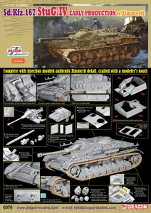 The Sturmgeschu"tz IV (Sd.Kfz.167) was designed by Krupp. Between December 1943 and the end of the war, Krupp built a total of 1108 new StuG IV vehicles at its Magdeburg plant, as well as converting another 31 from battle-damaged Panzer IVs. Like its StuG III brother, this assault gun proved to be an effective tank killer. It was operated by a crew of four – a commander, gunner, loader and driver. Main armament of the assault gun was a 75mm StuK 40 L/48 gun mounted in a cast “saukopf” mantlet equipped with 87 rounds. The vehicle was 6.7m long and weighed 25.9 tons.Size/Weight: 38.5 x 24.5 x 8.5 cm / 740g