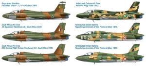 The Macchi MB-326 was developed during the 50s and it has been conceived as a two-seat  trainer to equip the Italian Air Force. MB-326 was powered by an English Bristol Siddley Viper  non-afterburning turbojet engine with low air-intakes in the wing roots. Thanks to the effectiveness of the concept, It rapidly obtained a commercial success and it was sold in over ten Countries. Later on, a single-seat ground attack aircraft has been developed starting from the Italian trainer. The Macchi MB-326K, the armed version powered with an higher performance turbojet engine, was able to carry more than 1800 kg. of offensive weapons in its under wing hard points including bombs, rocket launchers and guns in dedicated pods. The MB-326K was also produced under licence by the South African company Atlas Aircraft Corporation with the project name " "Impala".