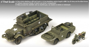 Academy 13408 1/72 U.S. M3 Half Track, 1/4-ton Amphibian Vehicle & Motorcycle (W.W.II)
