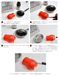 1) Dilute enamel color with Gaia T-05. 2) Fill the panel line with diluted enamel paint (Capillary Action). 3) Add a drop of paint at ~1cm interval. 4) Wipe off the extra enamel with Gaia G-06 Finish Master or cotton swab soaked with Enamel Thinner (X-20 / T-05)